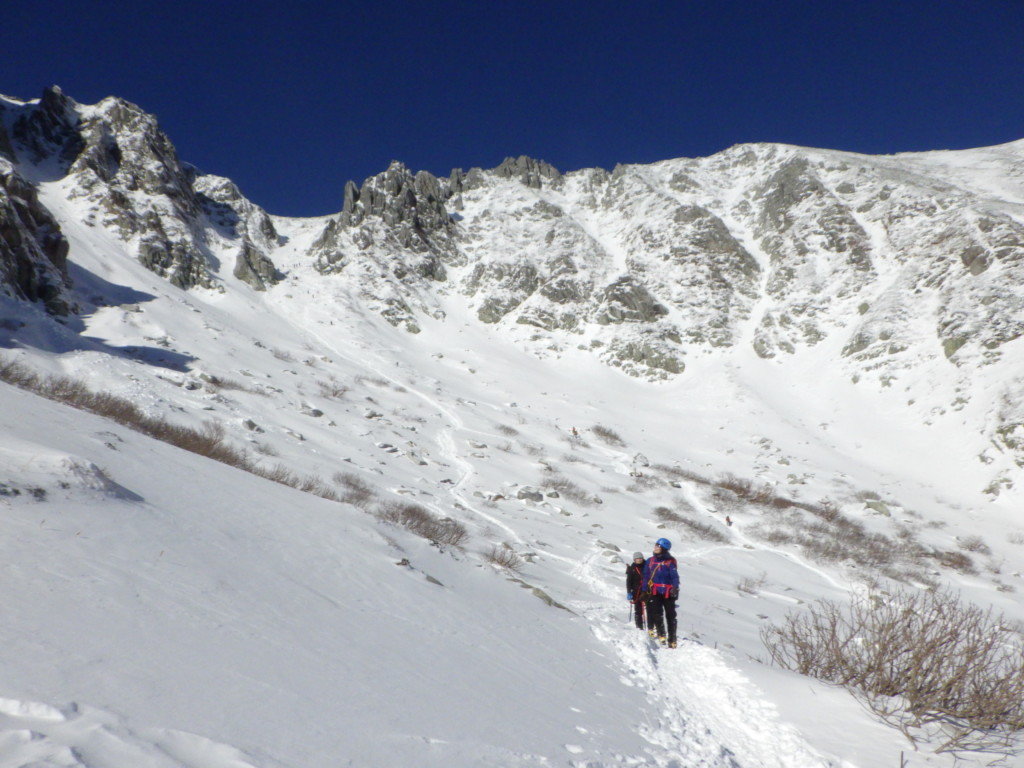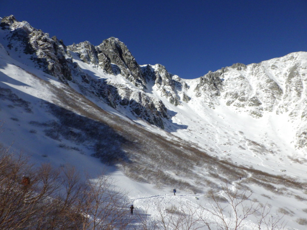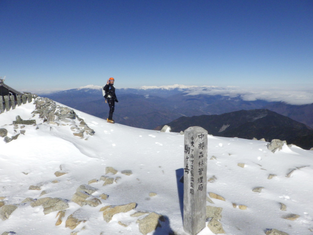 快晴で風も無く、最高の登山日和でした。 2年前の雪訓では気を付けて歩いた乗越浄土の手前も階段が出ている状態で、雪はとても少ない状態でした。木曽駒の頂上からは富士山、北・南アルプスなど360°の素晴らしい展望が望めました。計画より早く進んだので、宝剣岳にチャレンジする事にしました。ザックを置いて尾根沿いのルートから頂上を目指しました。登りは岩を掴んで登る事が出来、登りやすかったです。下りの急な所は横向きや後ろ向きでピッケルやアイゼンの爪の使い方を教えてもらいながら慎重に降りました。 素晴らしい景色の中、宝剣岳にも登る事が出来、大満足の山行でした。