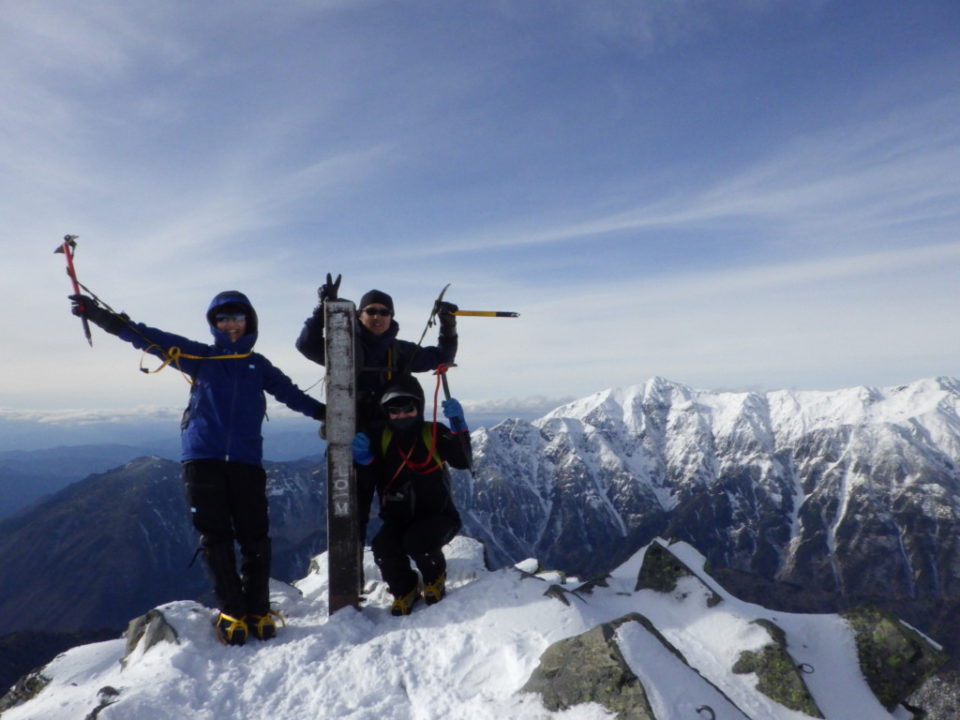 ロープウェイの新穂高口駅から西穂山荘まで1時間。11時からテント設営。テン場には3番目に着きましたが、次々とテント泊の人が来て、あっという間にテント場が埋まりました。やはり早目に着く事が大事だと思いました。昼食に西穂ラーメンを食べて、独標を目指しました。翌日の天気が怪しかったのと、下見を兼ねて独標まで登りました。独標までは沢山の人が登っていましたが、その先は全くトレースが無く、土曜日の為か誰も西穂を目指している人はいませんでした。2日目は7時に出発。遅めの出発だったため、独標から先にトレースがあり、山頂に向かうパーティーの姿も見えました。天気もまだまだ持ちそうな感じだったので、独標からの第一関門の下りを慎重に降りました。”槍が見える所まで頑張ろう”と登って行き、結局、西穂の頂上でやっと槍の穂先を見る事が出来ました。山頂に着いて槍ヶ岳を見た時は本当に感激でした。2日間とも空気が澄んでいる為か、周りの山がとても近く見えました。富士山、乗鞍、光があたって輝く白山。笠ヶ岳、双六もとても綺麗でした。土曜日の夜にテン場に向かって西穂山荘の方が天気について解説してくれ、今年は30年山荘で仕事をして来て、一番の雪の少なさと言う事でした。 雪が少ないのでピッケルを刺しても岩に当たって刺さらなかったり、アイゼンが引っ掛かったりで歩きにくかったですが、 今回の山行は経験豊富なCLから雪山の知識・技術を教えてもらう事が出来、とても良い経験が出来ました。ありがとうございました。