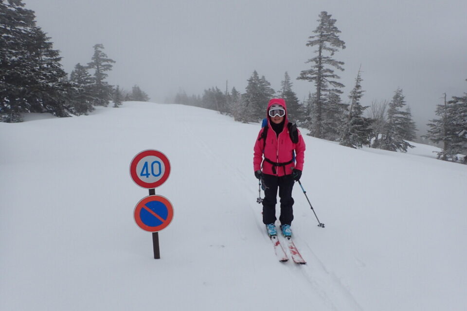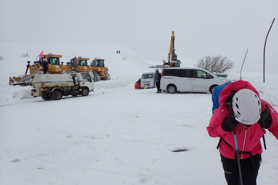 お邪魔にならないように、一部ツボ足で夏道沿い(ではないかもしれないけど、看板のようなものがあるので、これもあまり迷わない)を登って、駐車場へ着地。