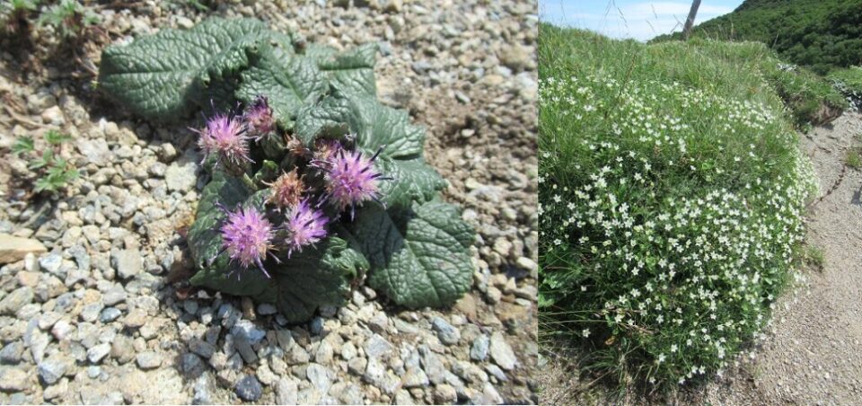 砂礫地に着くと花の植生が変わり、タカネツメクサやユキバヒゴタイ等と出会うことができた。もう少し早ければウルップソウが見られるのだろう。小さな神社の先に山頂となる。平日にも関わらず10名弱の登山客で賑わっていた。晴天の下、夕張山地が全て見渡せる。登ってきた前岳方面も非常に景色が良い。