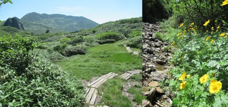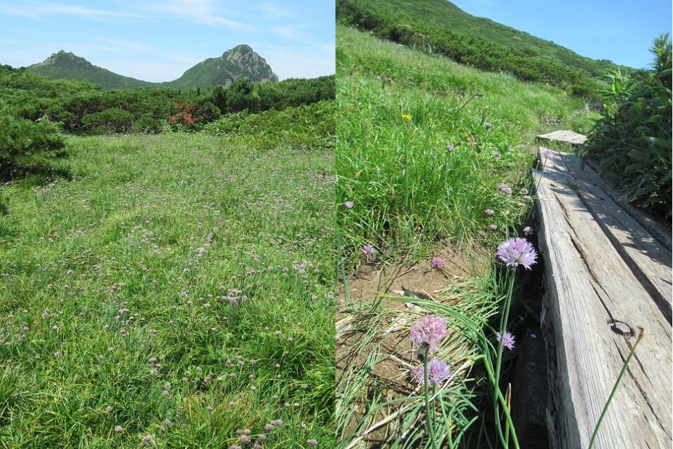 前岳を巻くとやっと夕張岳の全容が見え、山頂までなだらかな丘陵に花畑があることを想像しテンションが上がる。憩沢でシナノキンバイがお出迎え、その後木道を歩きながらお花畑を行く。シロウマアサツキが最盛期の様で、木道脇に群生している。