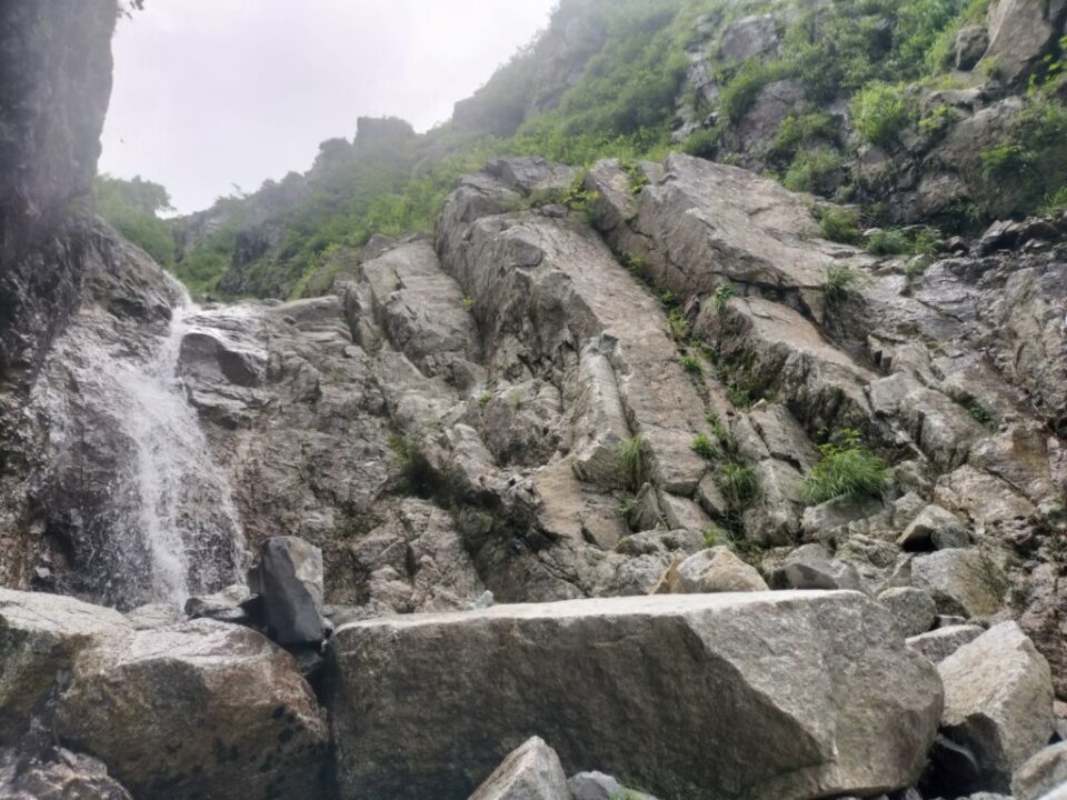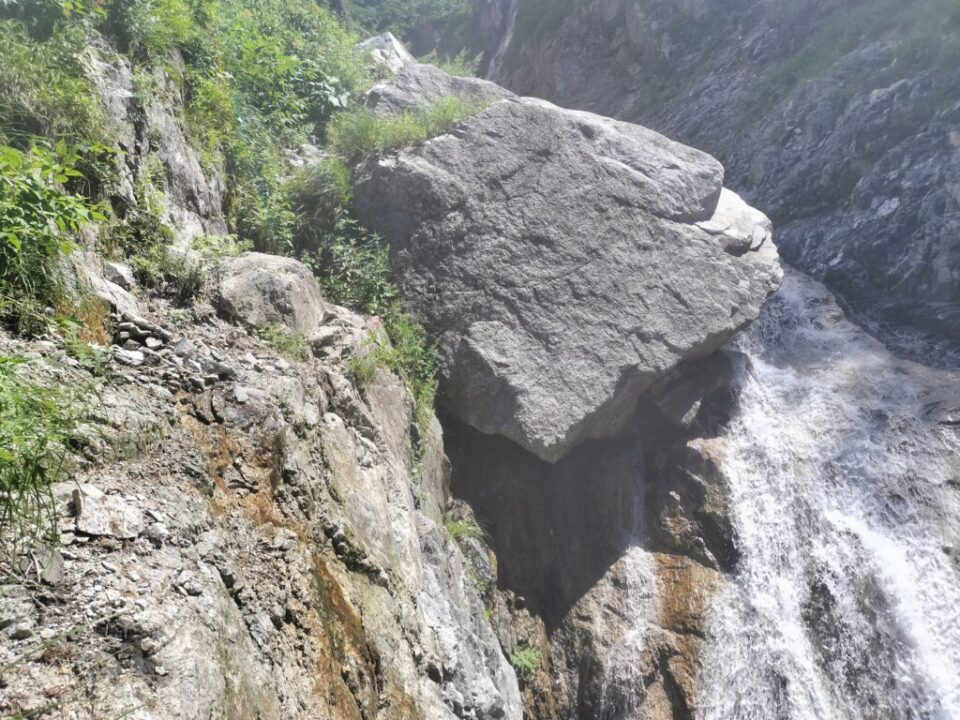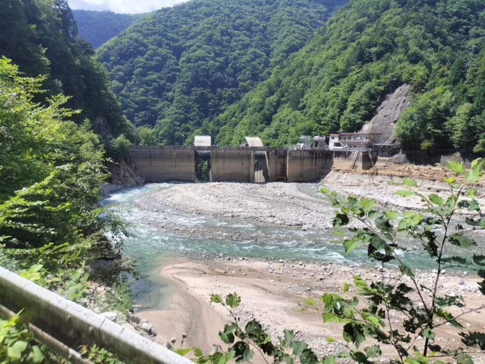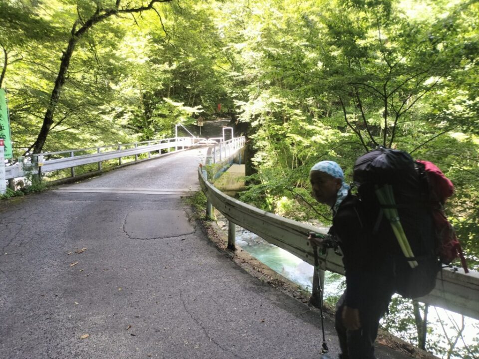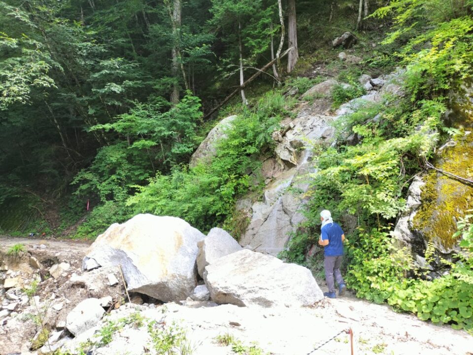 ゆっくり片付けを済ませ、9時半にテン場を出発した。綺麗な今朝沢を見ながら下っていく。工事の人が路肩で作業していた。お盆の土曜日なのに…。伊奈川ダムのすぐ上の分岐で休憩し、空荷で崩落現場を見に行った。分岐から5分程度の近さだった。道路に軽トラサイズの石が落ちており、これが上の支流から落ちてきたのかと思うと恐ろしい。人間はなんとか脇を通り抜けられそう。