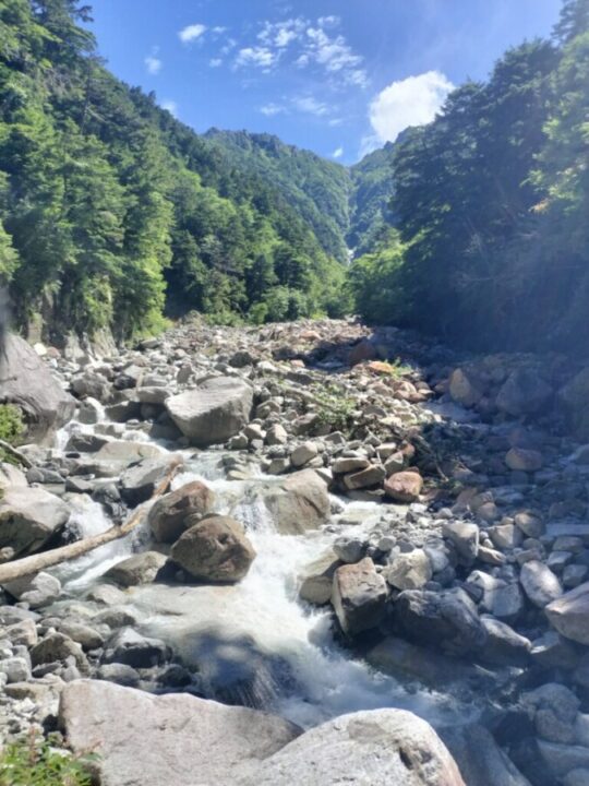 水は冷たいが、渡渉する程度なら問題ない。河原が広く、今日は快晴なので気持よく進める。何度も渡渉しながらゴーロ帯を先へ進む。水流は多いが、浅い箇所もたくさんあるので、渡渉に困ることは少なかった。