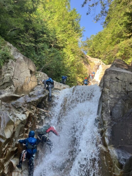 その後は、滝を泳いだり、ウォータースライダーをしたり、飛び込んだりしながら、童心に還る。下る途中で、足が滑って沢バイルに右腹を強打する。ちょっと痛みはあったが、そのまま下降を続け、14時前には車に到着する。