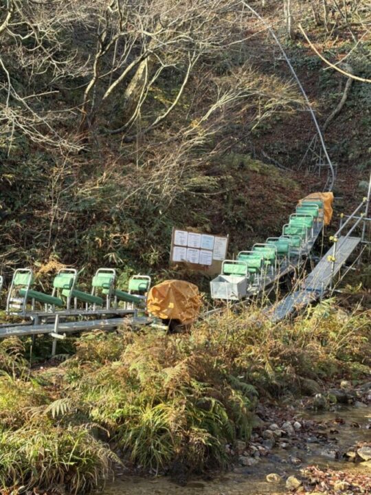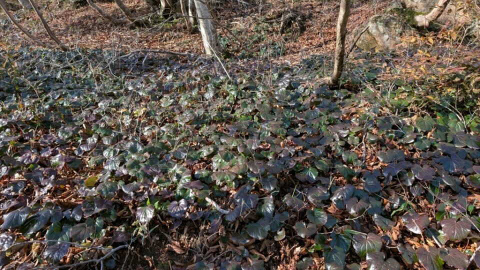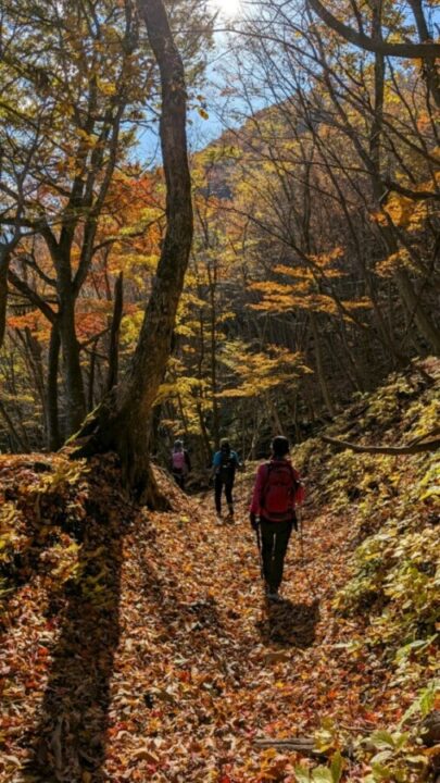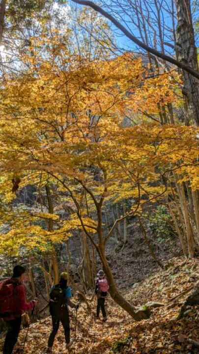 大谷山からはまた樹林帯を下るので眺望は無しでした。落ち葉の体積が凄くて、その下にある石や枝に足を取られるので、気を使いました。所々で獣臭がし、数日前に糞の報告も挙がっていて、今回も途中で糞を見つけたので、笛を吹きながら下山しました。少し緊張もありましたが、イワカガミの葉が群生していたり、標高400mくらいから登山口までは色づいた紅葉とその落ち葉で視界全体が黄色く染まるほどで、基本的には楽しんで下山できました。