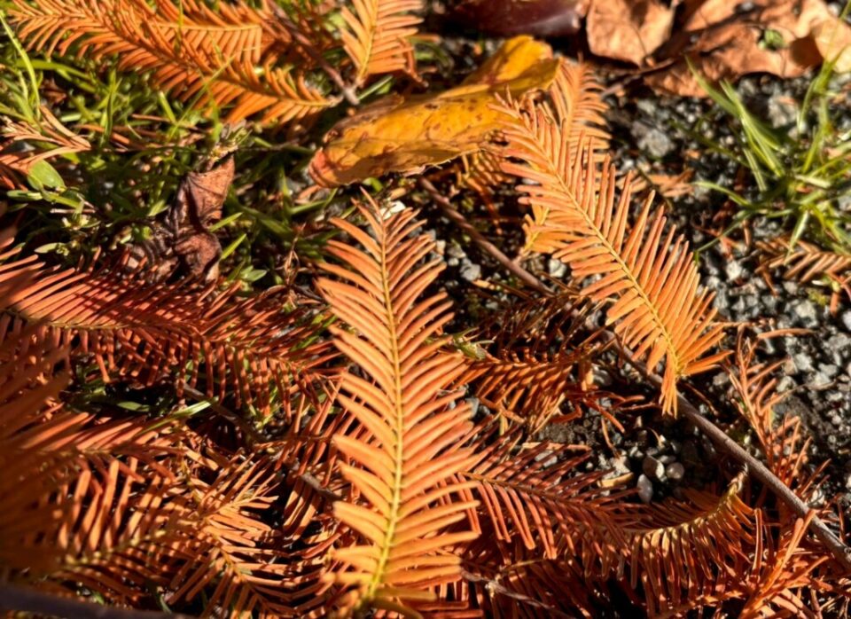 大谷山下山口からメタセコイヤ並木へ向かう道中、振り返ると登った山と歩いた稜線が見えました。大谷山山頂から大谷山下山口、そしてメタセコイヤ並木の近くまでは誰にも会いませんでしたが、メタセコイヤ並木のところは観光客でいっぱいで、並木道も車とバイクで大渋滞でした。メタセコイヤは黄金色に紅葉していて、樹が道路をトンネルのように覆っていて圧巻でした。