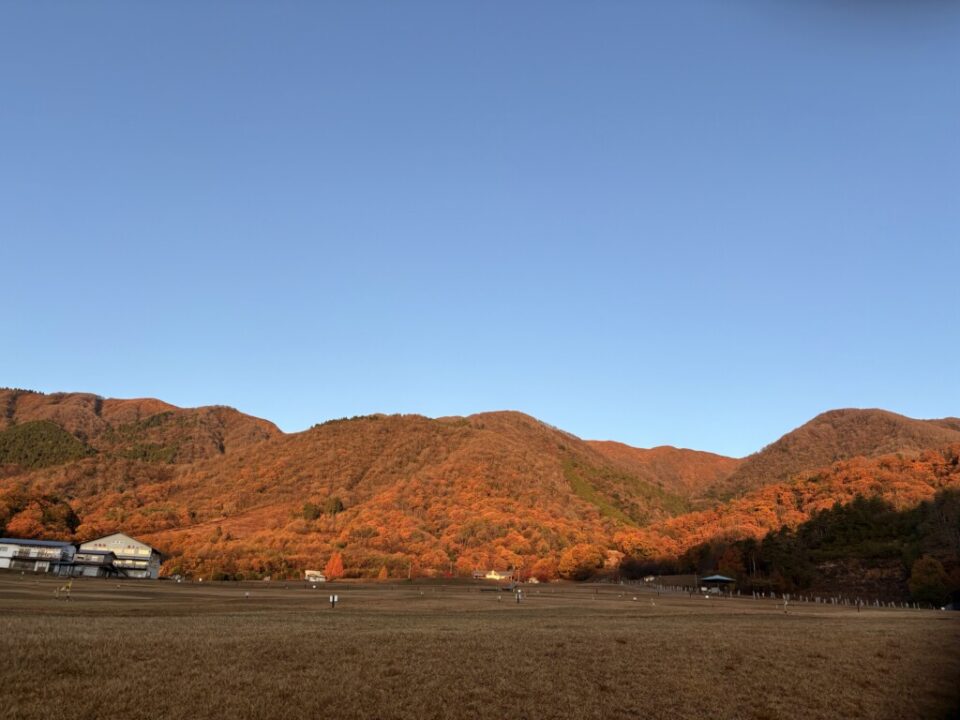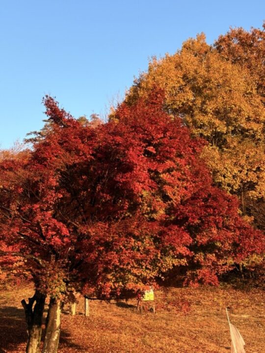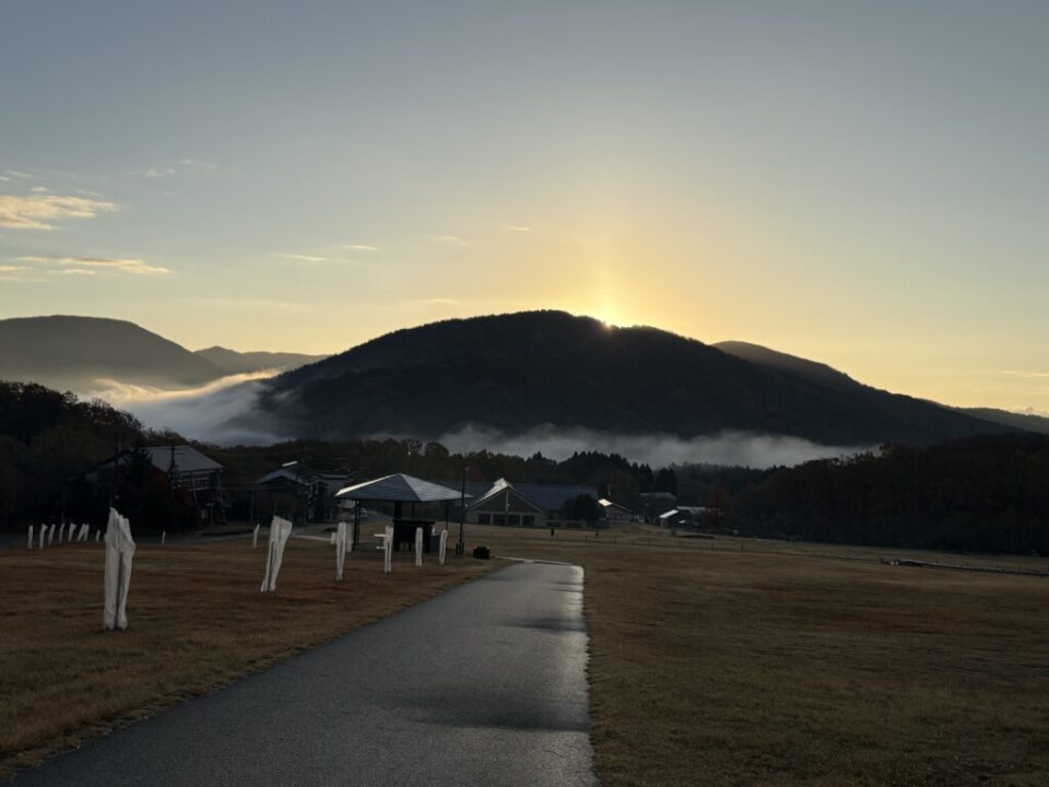 登山者駐車場からはスキー場の横を通って赤坂山登山口まで行きました。登山口付近は紅葉が見ごろでした。琵琶湖の近くだからか低い位置に雲海が見られ、ちょうど朝日も当たり美しい景色の中での登り始めとなりました。