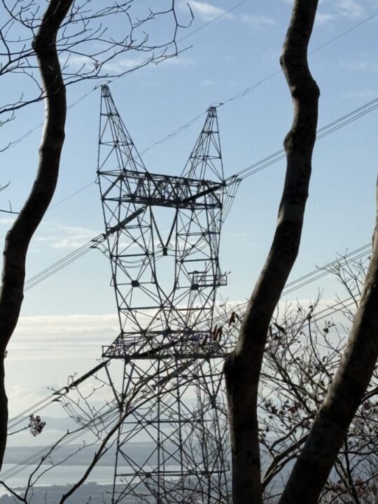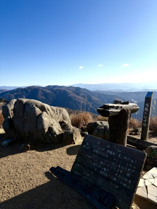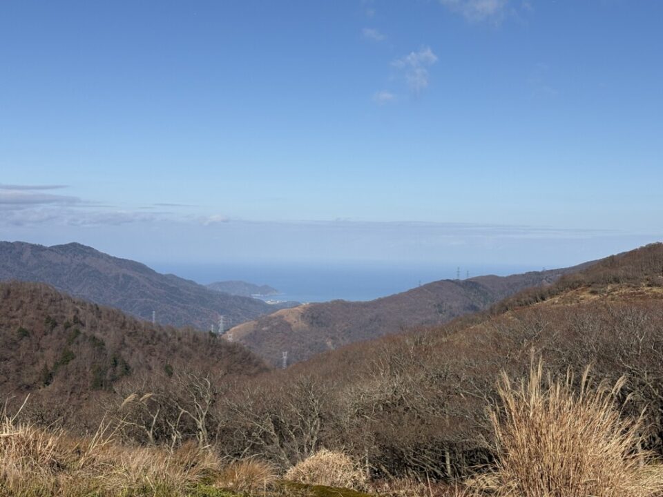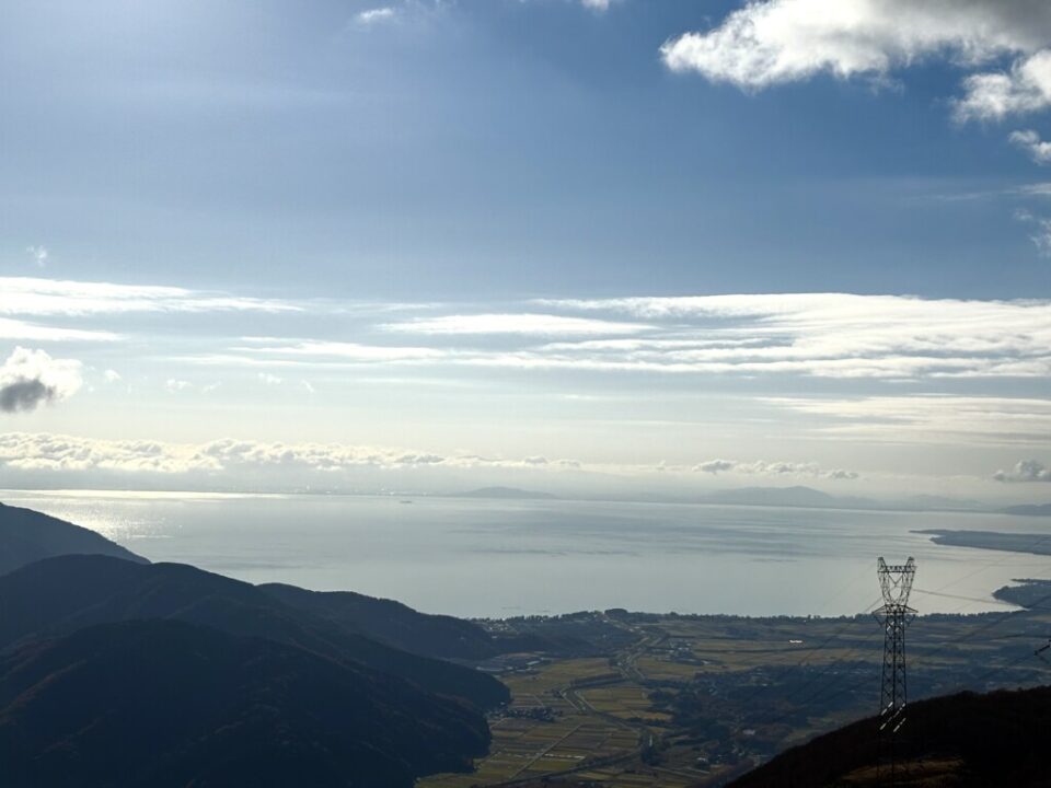 赤坂山から寒風(かんぷう)を通り大谷山(おおたにさん)までは高島トレイルの一部で、2時間弱の工程でした。その間はほぼずっと見事なススキの稜線歩きで、ちょうどよい微風で気持ちよく歩けました。琵琶湖やメタセコイヤ並木も見下ろせ、大谷山に近づくと琵琶湖に浮かぶ竹生島(ちくぶじま)や日本海も見えてきました。それなりにアップダウンがありましたが、ずっと景色を楽しめたのであまり気になりませんでした。