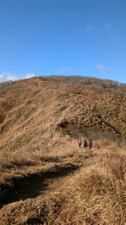 赤坂山から寒風(かんぷう)を通り大谷山(おおたにさん)までは高島トレイルの一部で、2時間弱の工程でした。その間はほぼずっと見事なススキの稜線歩きで、ちょうどよい微風で気持ちよく歩けました。琵琶湖やメタセコイヤ並木も見下ろせ、大谷山に近づくと琵琶湖に浮かぶ竹生島(ちくぶじま)や日本海も見えてきました。それなりにアップダウンがありましたが、ずっと景色を楽しめたのであまり気になりませんでした。