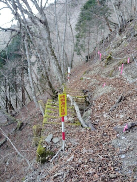 上佐野ヒュッテを7:30に出てしばらくすると天子が岳・長者ヶ岳の登山道に入った。急坂はない。山腹をトラバースする区間が長く、狭い道を落ち葉が塞いでいて慎重に歩いた。高度を上げると左手に南アルプスが見えてきた。道が崩れていてロープに頼ってよじ登るところもあった。