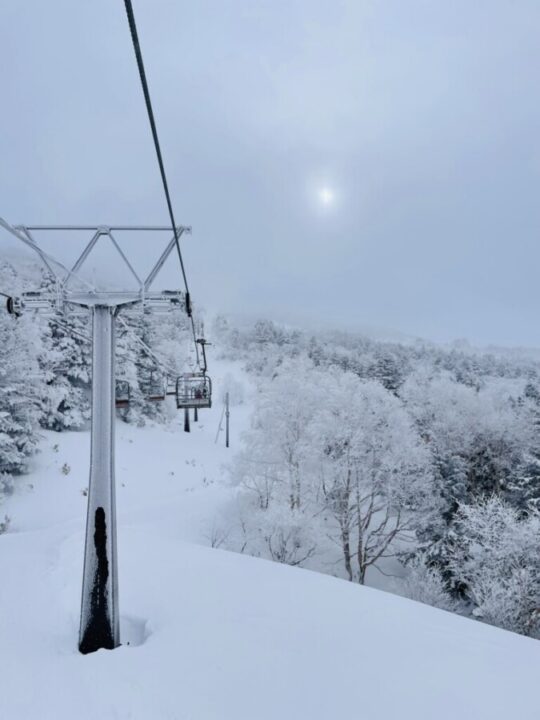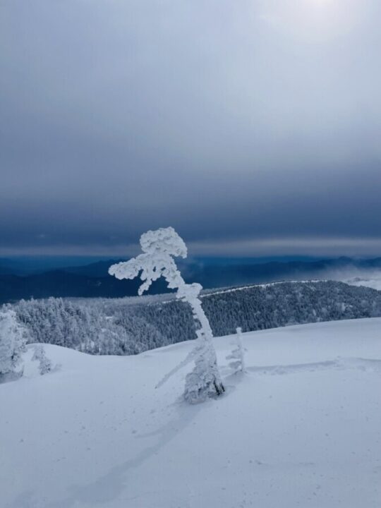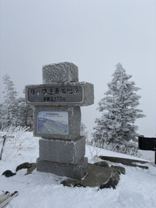 日曜日より土曜日のほうが気候条件が良さそうと判断して、土曜日に横手山に登ることになりました。陽坂の駐車場はたくさんの車がいましたが、まだ余裕はありました。リフトに乗るので、寒さ対策を万全にして、スキーとスノーシューを持って出発。リフト乗り場でリフト券を購入し、2つのリフトを乗り継いで横手山ゲレンデトップへ。カフェの1階スペースで、着込んでいた衣類を脱いで調整してから、スキーやスノーシューを装着して歩き始めました。一瞬の晴れ間があり、稜線に伸びる国道を見ることができました。すぐに横手山山頂に到着。山頂付近ではチビスノーモンスターを見ることができました。少し進むと、長野県と群馬県の境目に建つ渋峠ホテルに到着したので、お決まりのポーズで記念写真を撮りました。