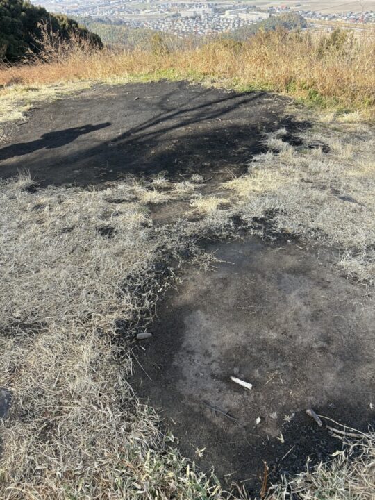 かぎ万灯の篝火を焚いた痕。 山頂から いきものふれあいの里 ネイチャーセンター方面へ下る