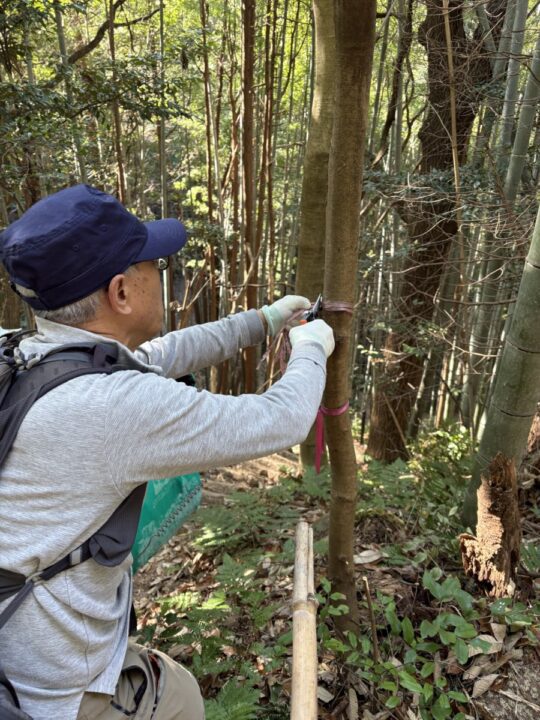 竹と雑木が混在する中 劣化した紐やテープなどを撤去
