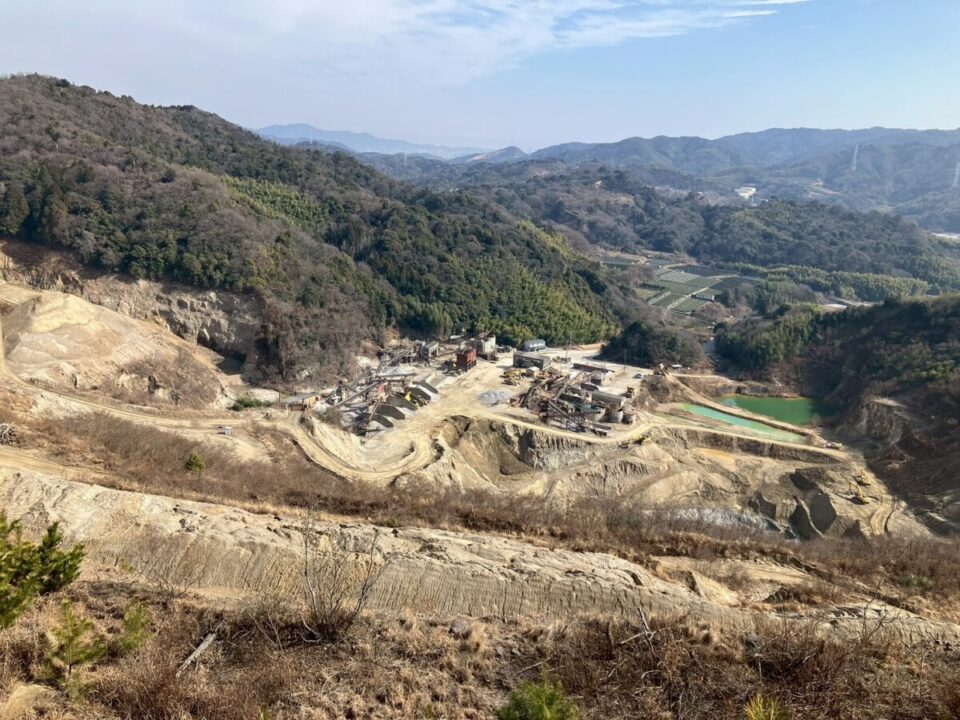 途中 眼下に見える砕石場。 三ヶ根山方面と奥に遠望峰山方面も見える