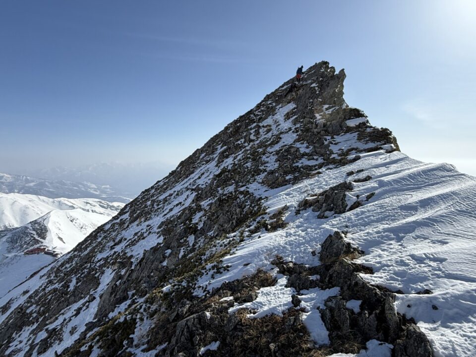 9:40 五竜岳登頂。ここまで来ないと見えない北側の景色は夏よりもずっと綺麗でカッコ良かった。貸し切りの絶景の中酔いしれているが帰りが大変。